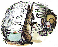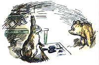 Nyuszi gondolkodva simogatta pofaszakállát, aztán kifejtette, hogy amennyiben Micimackót sikerülne is visszatolni, ő a maga részéről, természetesen, mindig szívesen látja barátját házában, de hát mégis...úgy van az a világban, hogy egyik ember a fák tetején lakik, a másik pedig a föld alatt, ez a dolgok szabályos rendje, tehát a maga részéről...